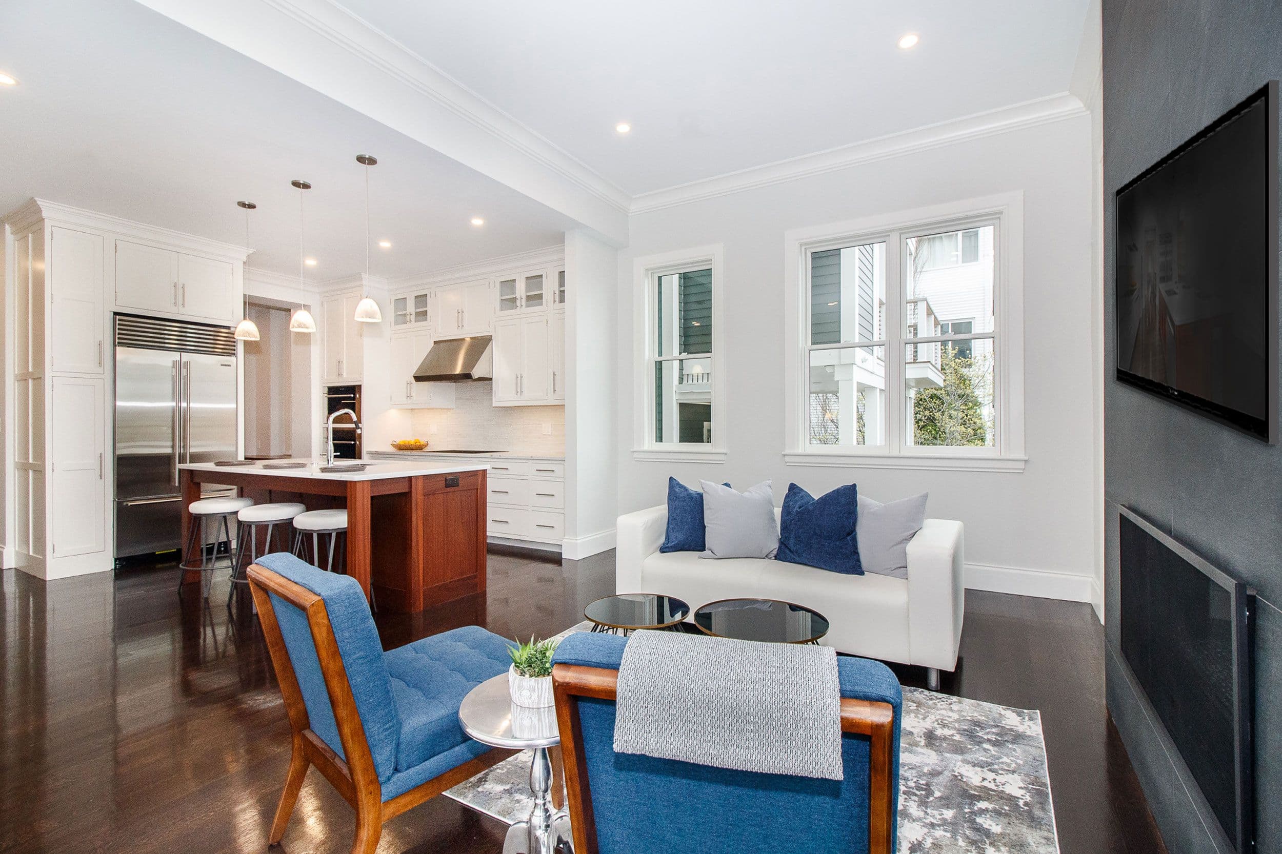 By the time firefighters were able to tame this massive six alarm fire in Charlestown, Lion House and its adjacent buildings suffered extensive damage. After determining the brick portion of the building still maintained its structural integrity, Studio DRAW designed a new five story wood construction addition to the rear of the building. The site conditions were particularly challenging due to the elevation change from front to back, with the driveway level being approximately 20’ below the ground floor elevation of the house. This gave us an opportunity to design a green roof over the garage, allowing the tenants to have a place to garden and enjoy the outdoors in a densely packed neighborhood. Studio DRAW also handled the interior design for all four of the apartments. The result was an upgraded building with four unique condominiums meticulously designed to cater to each of the existing tenants’ aesthetic preferences.