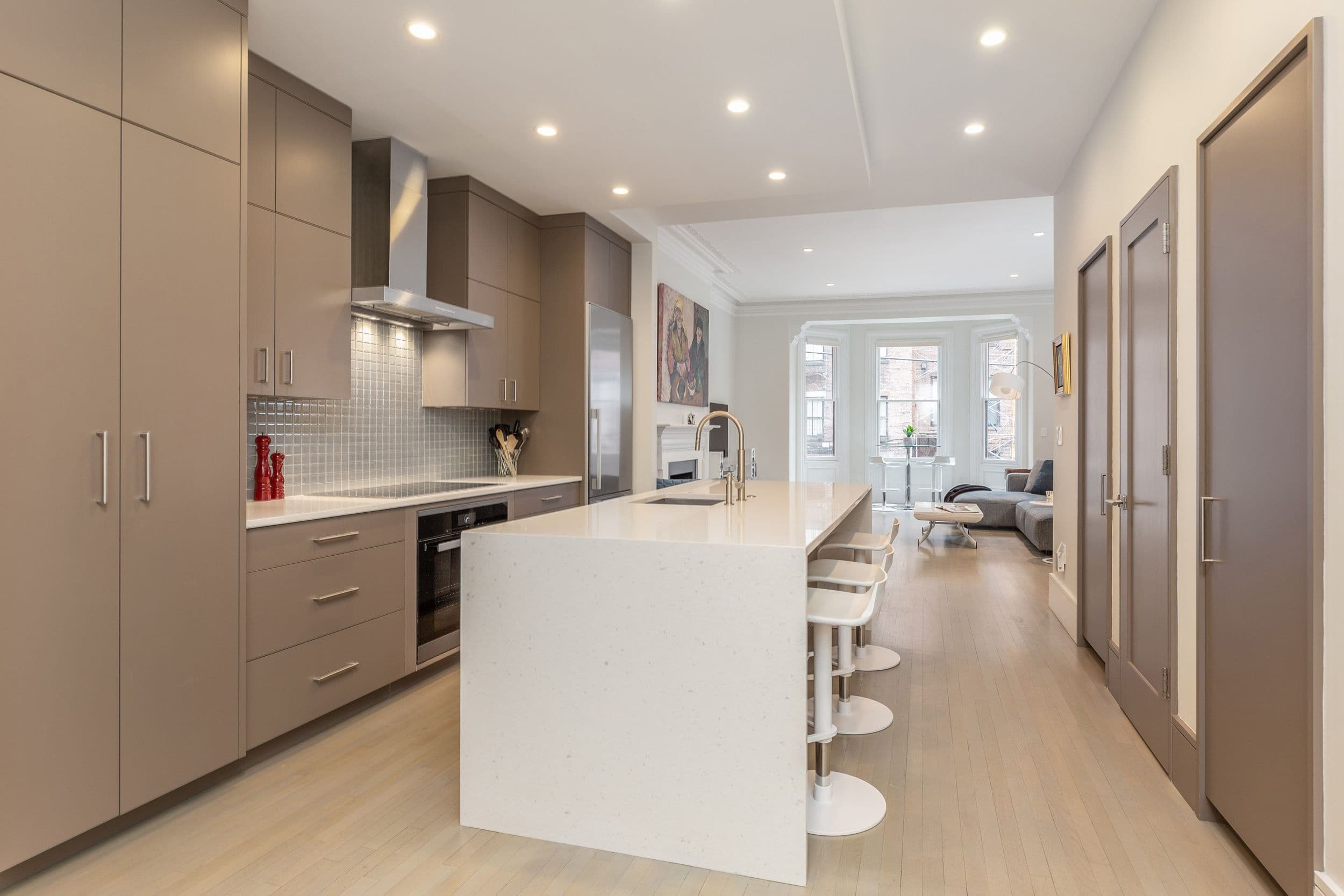 Victorian townhouses are magnificent yet tend to be dark with discrete rooms, and this building in Boston’s Back Bay was no exception. The clients, who grew up in the house as children, wanted to transform the space into a home that was bright and comfortable. By opening the parlor level up completely from front to back, spaces flow from one to another and provide a corridor for natural light to illuminate the innermost parts of the home. Traditional details are contrasted by a sleek modern kitchen at the heart, and a modern glass railing at the original staircase. A neutral palette is used throughout and unifies the living spaces by offering a sense of consistency. Lighter colors enliven the bedrooms that do not have the advantage of direct natural illumination. The result is a unique, bright, and spacious modern home that is defined not by its constraints, but by its feeling of openness, unity, and luxury.