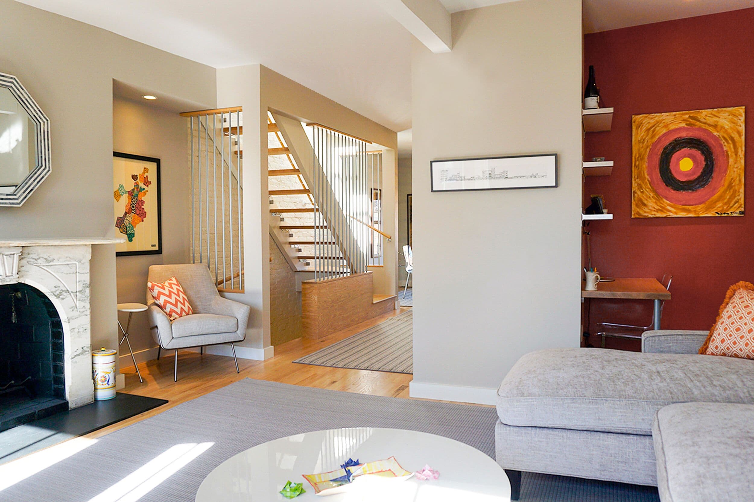 Using the existing staircase as a unifying element, this three-story penthouse was transformed from a glum 1980’s renovation into a bright and welcoming home. Due to technical reasons, the existing stair to the roof could not be removed. Instead, it was re-imagined by replacing much of the stairwell enclosure with vertical aluminum elements tied together with custom millwork. Glass risers and polished chrome hardware give the stair just the right amount of sparkling opulence. The dilapidated and dark roof penthouse was removed and reinvented as an open, zinc-clad family room with expansive views of Boston’s Back Bay and South End. With carefully placed splashes of color, modern furnishings, and crafty details this Victorian home entered the 21st century.
