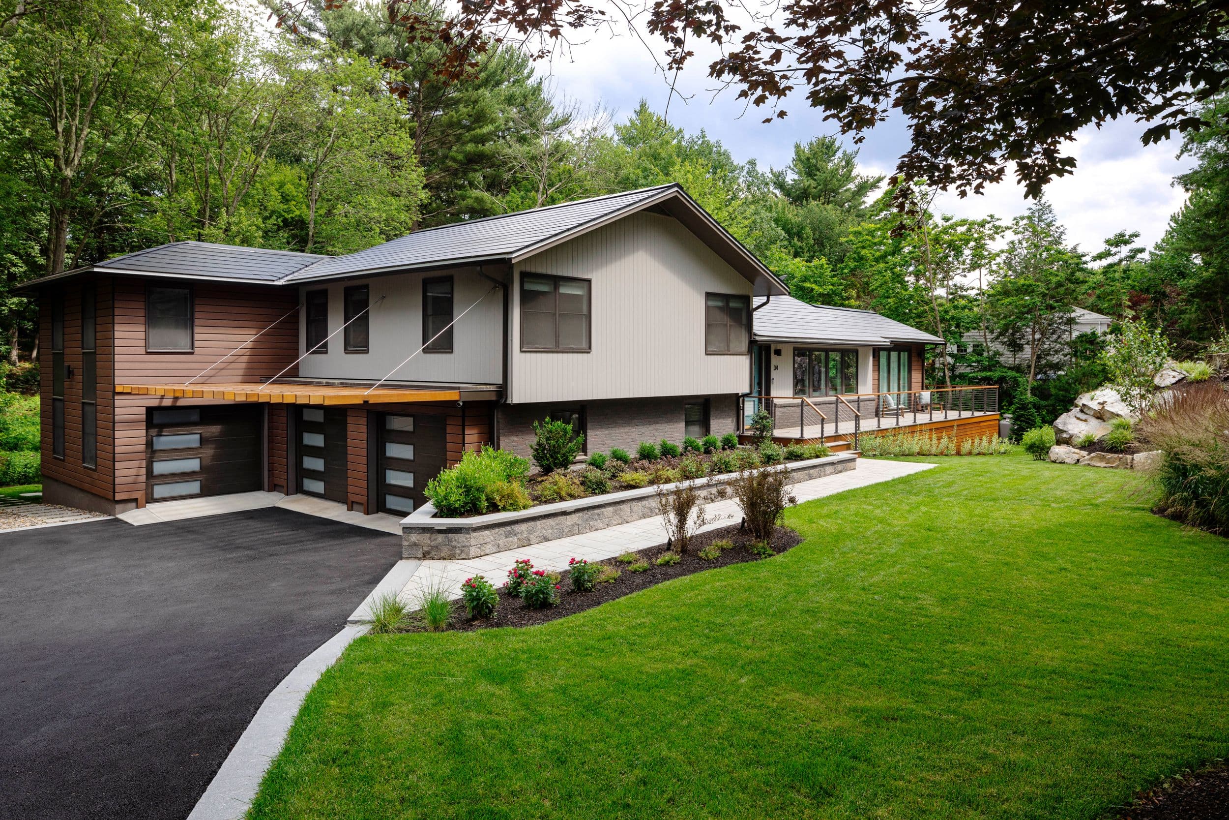 Our clients came to us with a need for more space. With a growing family and an under-utilized property, we collectively came up with the idea of two distinct additions, which would be designed in a way to complement the formal qualities of the existing structure while remaining distinct and modern. By doing targeted enhancements to the main structure, we seamlessly made the entire house and newly added additions blend into a mid-century modern oasis. The new additions comprised of expanded garage/workshop/gym space, a master bedroom and bathroom with Juliet balcony, a new four-season room that is used as a dining area, and new wrap around porch to connect to the back yard.